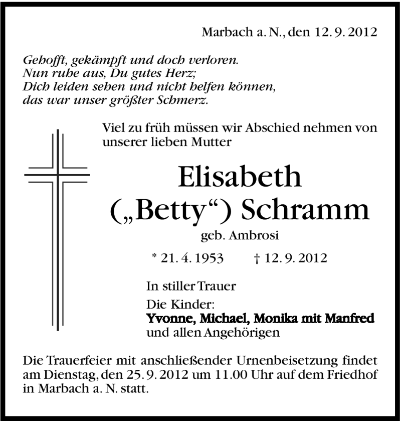 Hier finden Sie alle Traueranzeigen aus der Zeitung, die bisher für Elisabeth Schramm erschienen sind. Weitere Traueranzeigen, die in der Zeitung erscheinen, werden hier ebenfalls aufgelistet