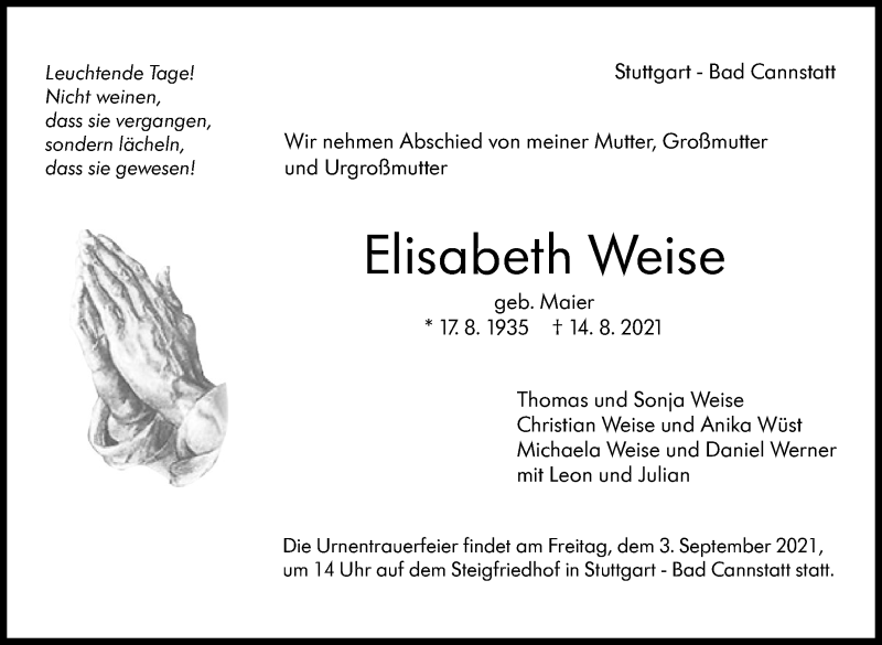 Hier finden Sie alle Traueranzeigen aus der Zeitung, die bisher für Elisabeth Weise erschienen sind. Weitere Traueranzeigen, die in der Zeitung erscheinen, werden hier ebenfalls aufgelistet