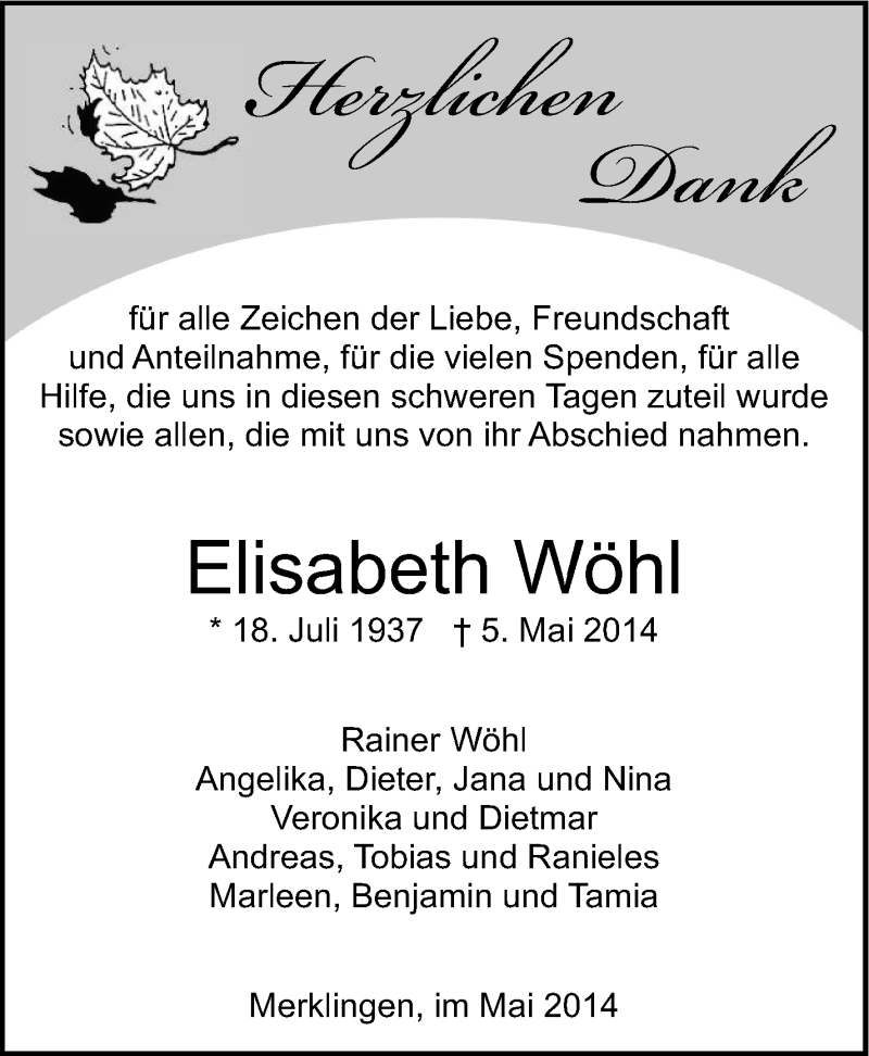 Hier finden Sie alle Traueranzeigen aus der Zeitung, die bisher für Elisabeth Wöhl erschienen sind. Weitere Traueranzeigen, die in der Zeitung erscheinen, werden hier ebenfalls aufgelistet