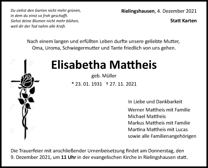 Hier finden Sie alle Traueranzeigen aus der Zeitung, die bisher für Elisabetha Mattheis erschienen sind. Weitere Traueranzeigen, die in der Zeitung erscheinen, werden hier ebenfalls aufgelistet