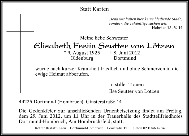 Hier finden Sie alle Traueranzeigen aus der Zeitung, die bisher für Elisabeth Freiin Seutter von Lötzen erschienen sind. Weitere Traueranzeigen, die in der Zeitung erscheinen, werden hier ebenfalls aufgelistet