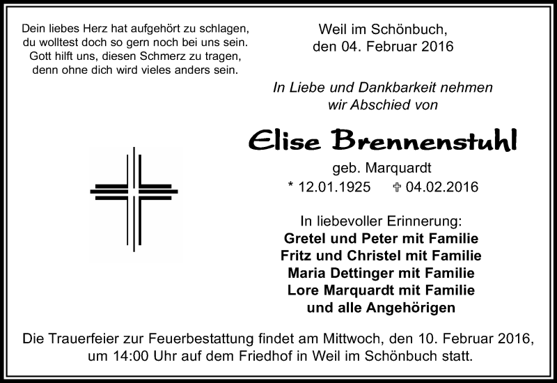 Hier finden Sie alle Traueranzeigen aus der Zeitung, die bisher für Elise Brennenstuhl erschienen sind. Weitere Traueranzeigen, die in der Zeitung erscheinen, werden hier ebenfalls aufgelistet