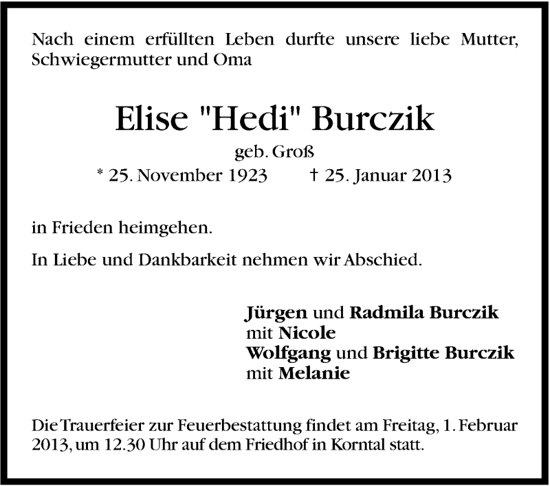 Hier finden Sie alle Traueranzeigen aus der Zeitung, die bisher für Elise Burczik erschienen sind. Weitere Traueranzeigen, die in der Zeitung erscheinen, werden hier ebenfalls aufgelistet