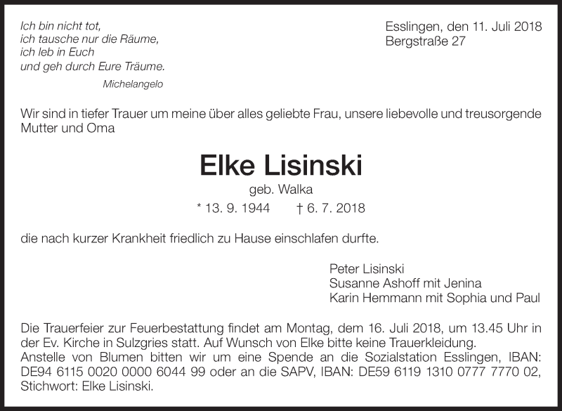 Hier finden Sie alle Traueranzeigen aus der Zeitung, die bisher für Elke Lisinski erschienen sind. Weitere Traueranzeigen, die in der Zeitung erscheinen, werden hier ebenfalls aufgelistet