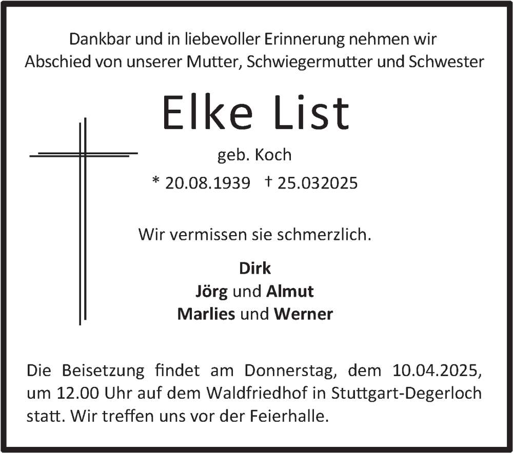 Hier finden Sie alle Traueranzeigen aus der Zeitung, die bisher für Elke List erschienen sind. Weitere Traueranzeigen, die in der Zeitung erscheinen, werden hier ebenfalls aufgelistet