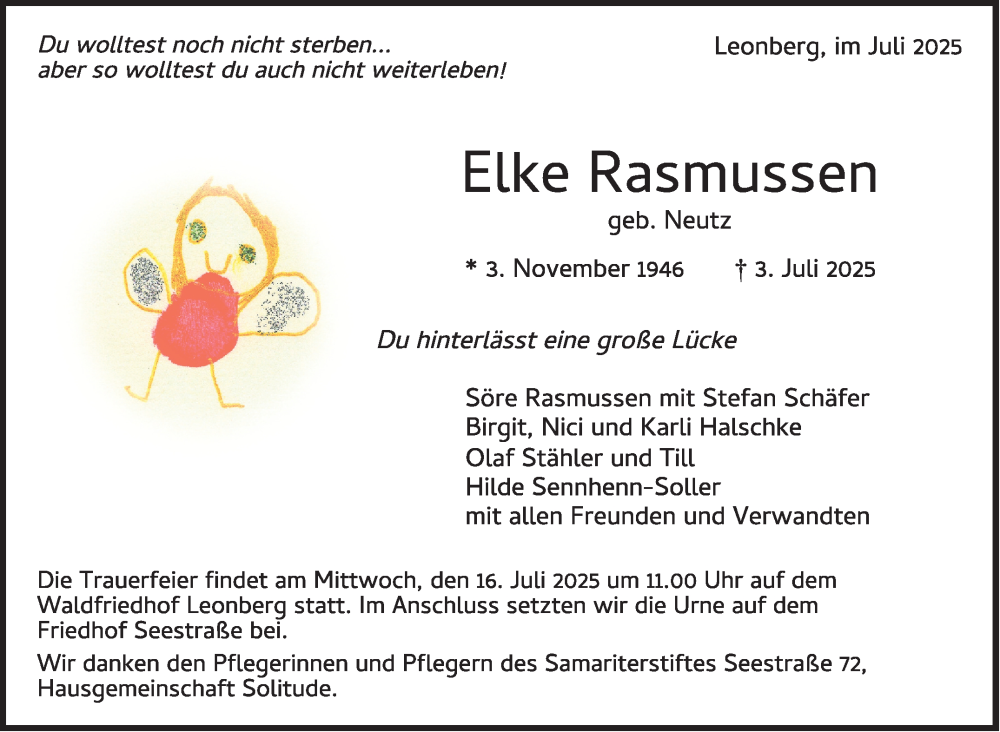 Hier finden Sie alle Traueranzeigen aus der Zeitung, die bisher für Elke Rasmussen erschienen sind. Weitere Traueranzeigen, die in der Zeitung erscheinen, werden hier ebenfalls aufgelistet