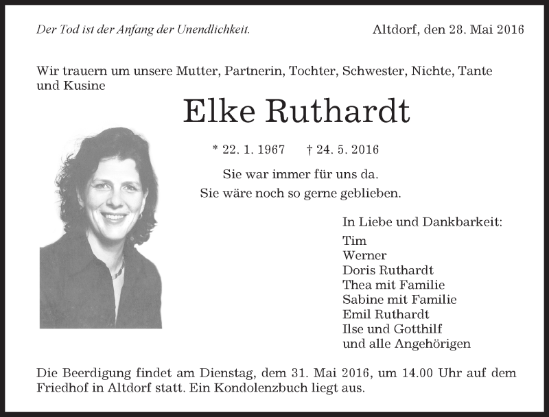 Hier finden Sie alle Traueranzeigen aus der Zeitung, die bisher für Elke Ruthardt erschienen sind. Weitere Traueranzeigen, die in der Zeitung erscheinen, werden hier ebenfalls aufgelistet