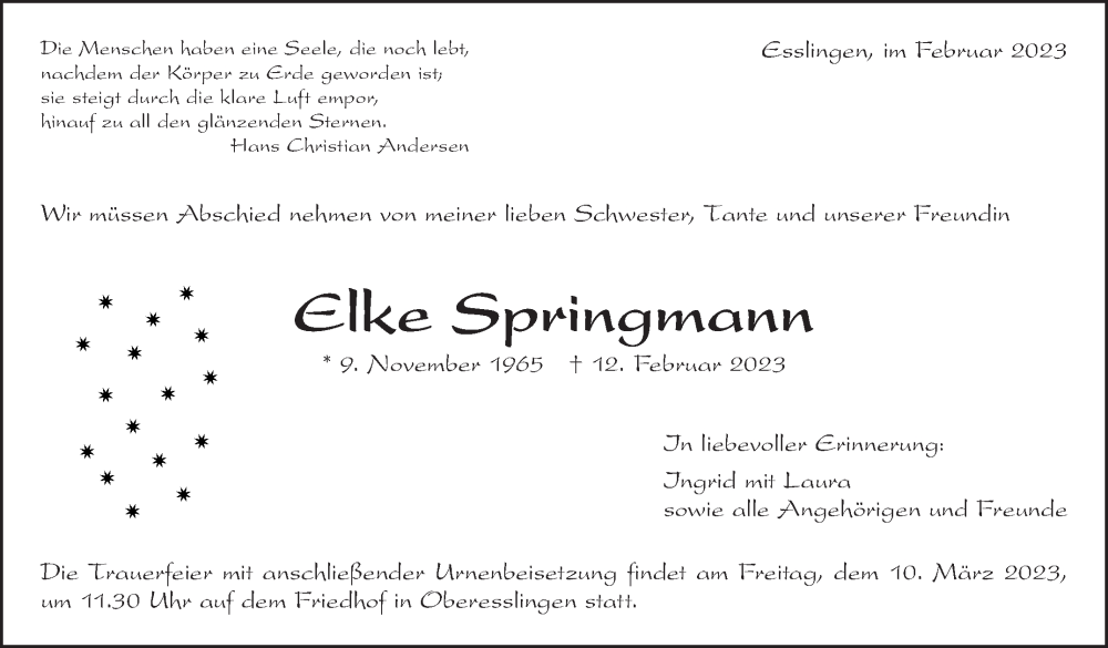 Hier finden Sie alle Traueranzeigen aus der Zeitung, die bisher für Elke Springmann erschienen sind. Weitere Traueranzeigen, die in der Zeitung erscheinen, werden hier ebenfalls aufgelistet