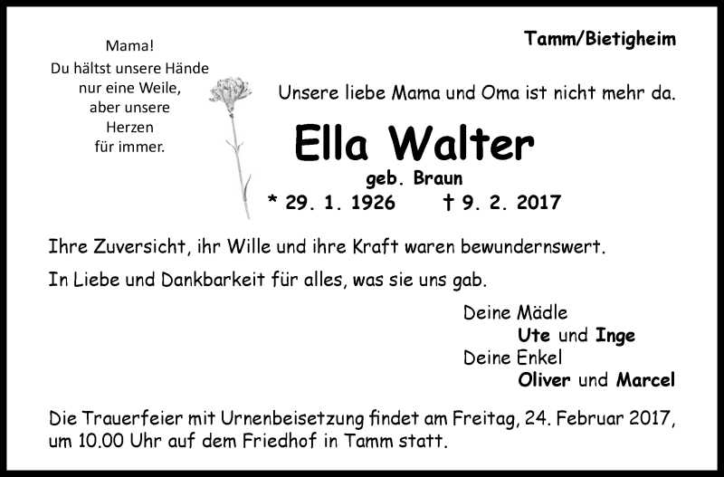 Hier finden Sie alle Traueranzeigen aus der Zeitung, die bisher für Ella Walter erschienen sind. Weitere Traueranzeigen, die in der Zeitung erscheinen, werden hier ebenfalls aufgelistet