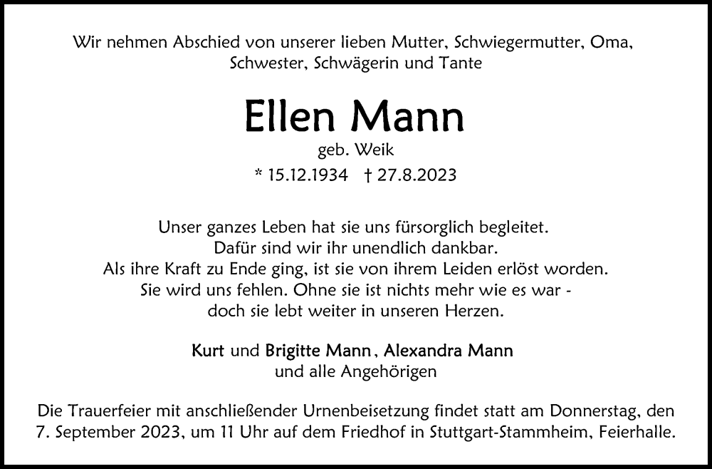 Hier finden Sie alle Traueranzeigen aus der Zeitung, die bisher für Ellen Mann erschienen sind. Weitere Traueranzeigen, die in der Zeitung erscheinen, werden hier ebenfalls aufgelistet