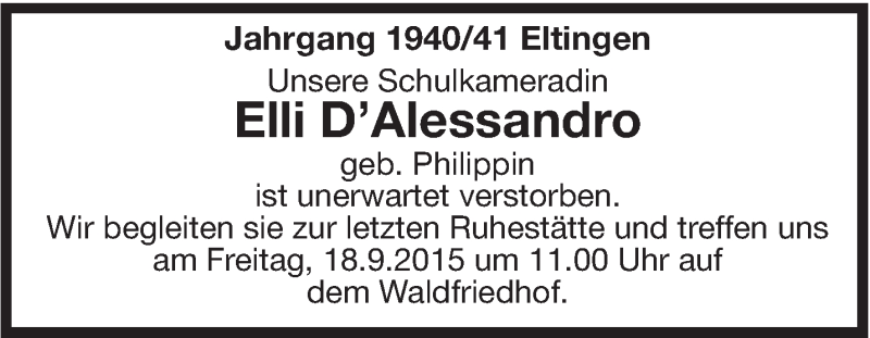 Hier finden Sie alle Traueranzeigen aus der Zeitung, die bisher für Elli D'Alessandro erschienen sind. Weitere Traueranzeigen, die in der Zeitung erscheinen, werden hier ebenfalls aufgelistet