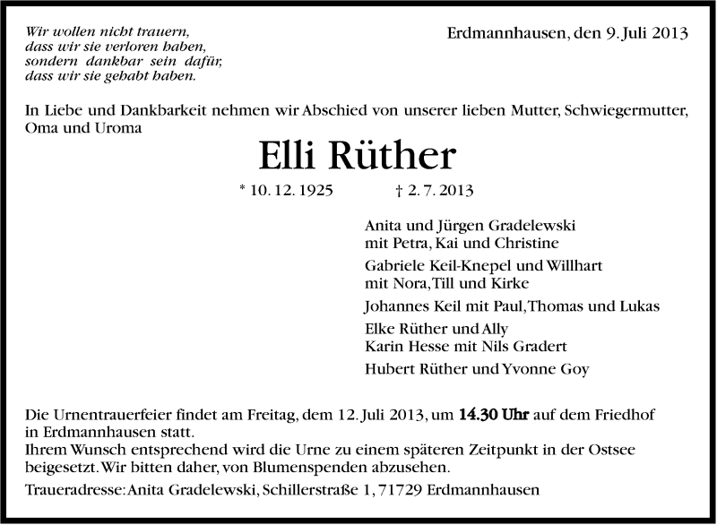 Hier finden Sie alle Traueranzeigen aus der Zeitung, die bisher für Elli Rüther erschienen sind. Weitere Traueranzeigen, die in der Zeitung erscheinen, werden hier ebenfalls aufgelistet