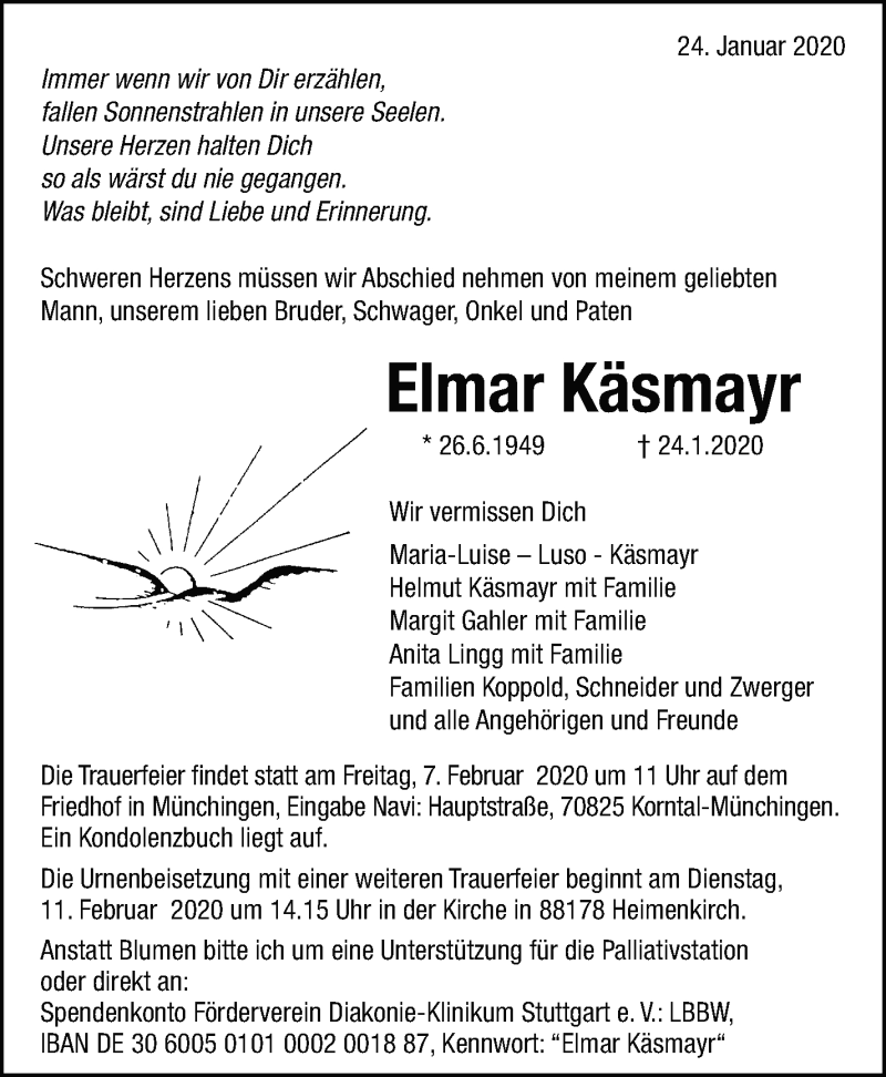Hier finden Sie alle Traueranzeigen aus der Zeitung, die bisher für Elmar Käsmayr erschienen sind. Weitere Traueranzeigen, die in der Zeitung erscheinen, werden hier ebenfalls aufgelistet