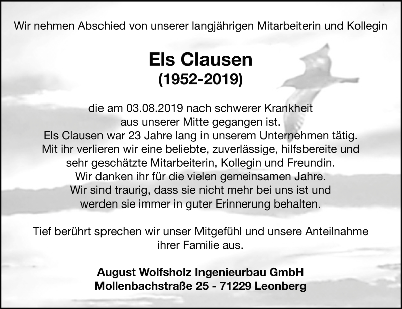 Hier finden Sie alle Traueranzeigen aus der Zeitung, die bisher für Els Clausen erschienen sind. Weitere Traueranzeigen, die in der Zeitung erscheinen, werden hier ebenfalls aufgelistet