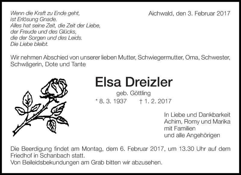 Hier finden Sie alle Traueranzeigen aus der Zeitung, die bisher für Elsa Dreizier erschienen sind. Weitere Traueranzeigen, die in der Zeitung erscheinen, werden hier ebenfalls aufgelistet