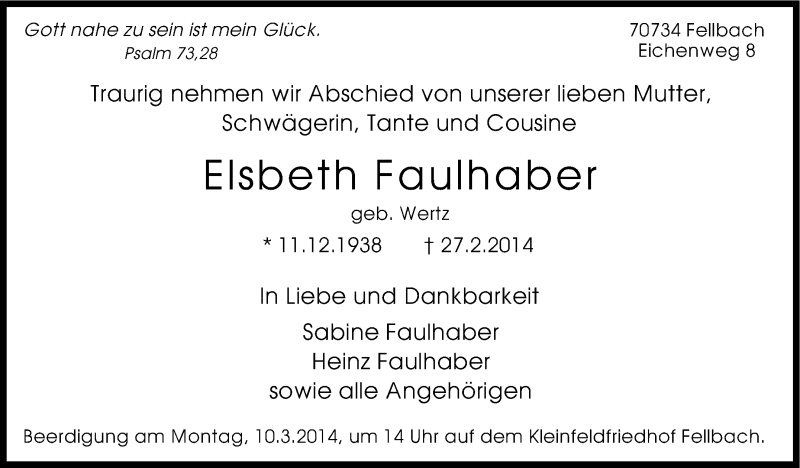 Hier finden Sie alle Traueranzeigen aus der Zeitung, die bisher für Elsbeth Faulhaber erschienen sind. Weitere Traueranzeigen, die in der Zeitung erscheinen, werden hier ebenfalls aufgelistet