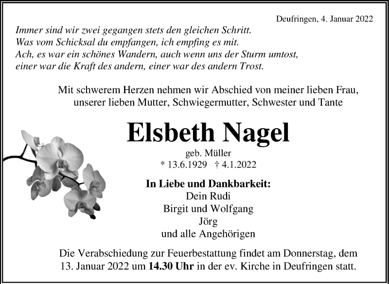Hier finden Sie alle Traueranzeigen aus der Zeitung, die bisher für Elsbeth Nagel erschienen sind. Weitere Traueranzeigen, die in der Zeitung erscheinen, werden hier ebenfalls aufgelistet