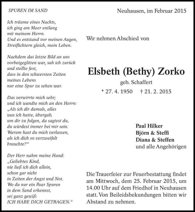 Hier finden Sie alle Traueranzeigen aus der Zeitung, die bisher für Elsbeth Zorko erschienen sind. Weitere Traueranzeigen, die in der Zeitung erscheinen, werden hier ebenfalls aufgelistet