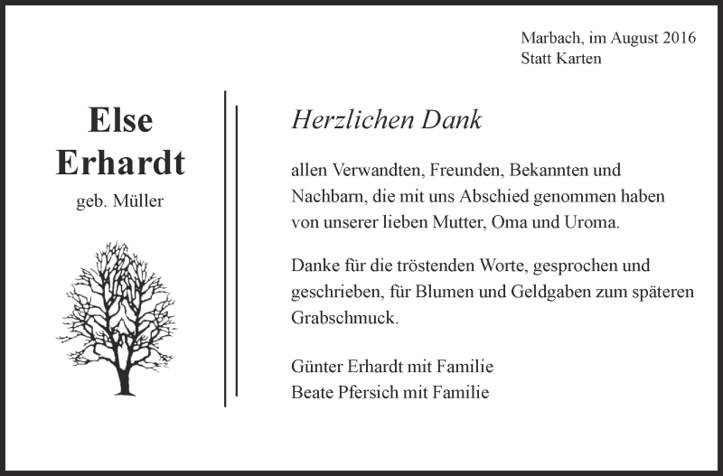 Hier finden Sie alle Traueranzeigen aus der Zeitung, die bisher für Else Erhardt erschienen sind. Weitere Traueranzeigen, die in der Zeitung erscheinen, werden hier ebenfalls aufgelistet