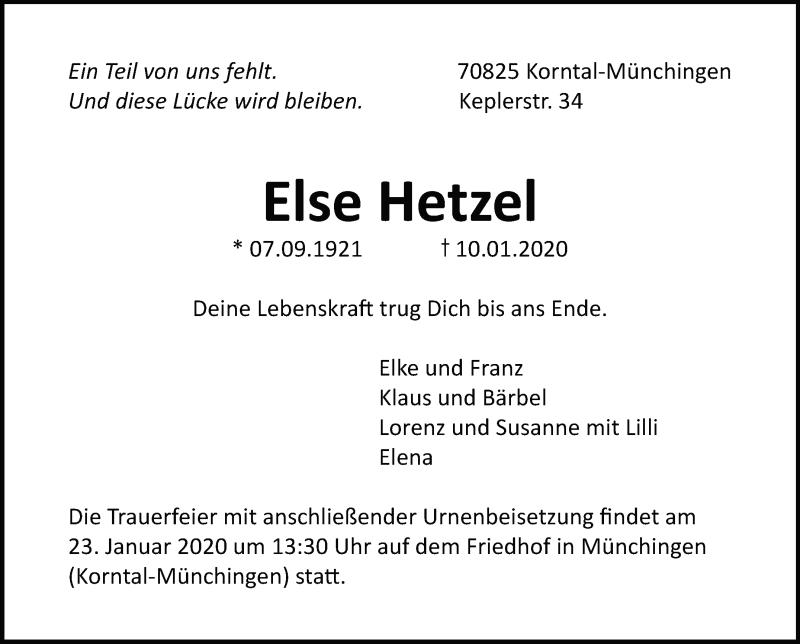 Hier finden Sie alle Traueranzeigen aus der Zeitung, die bisher für Else Hetzel erschienen sind. Weitere Traueranzeigen, die in der Zeitung erscheinen, werden hier ebenfalls aufgelistet