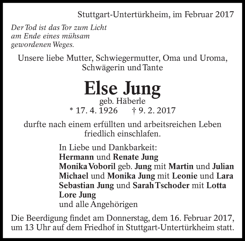 Hier finden Sie alle Traueranzeigen aus der Zeitung, die bisher für Else Jung erschienen sind. Weitere Traueranzeigen, die in der Zeitung erscheinen, werden hier ebenfalls aufgelistet