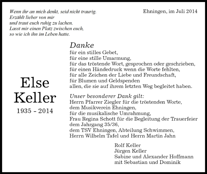 Hier finden Sie alle Traueranzeigen aus der Zeitung, die bisher für Else Keller erschienen sind. Weitere Traueranzeigen, die in der Zeitung erscheinen, werden hier ebenfalls aufgelistet