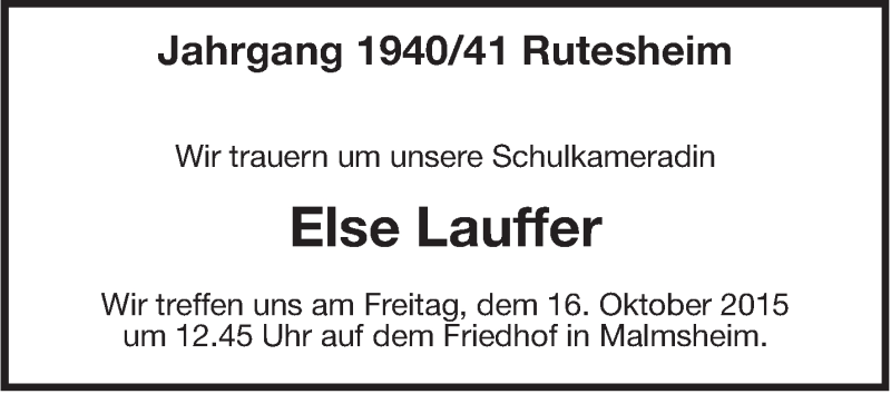 Hier finden Sie alle Traueranzeigen aus der Zeitung, die bisher für Else Lauffer erschienen sind. Weitere Traueranzeigen, die in der Zeitung erscheinen, werden hier ebenfalls aufgelistet
