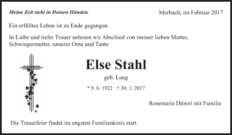 Hier finden Sie alle Traueranzeigen aus der Zeitung, die bisher für Else Stahl erschienen sind. Weitere Traueranzeigen, die in der Zeitung erscheinen, werden hier ebenfalls aufgelistet