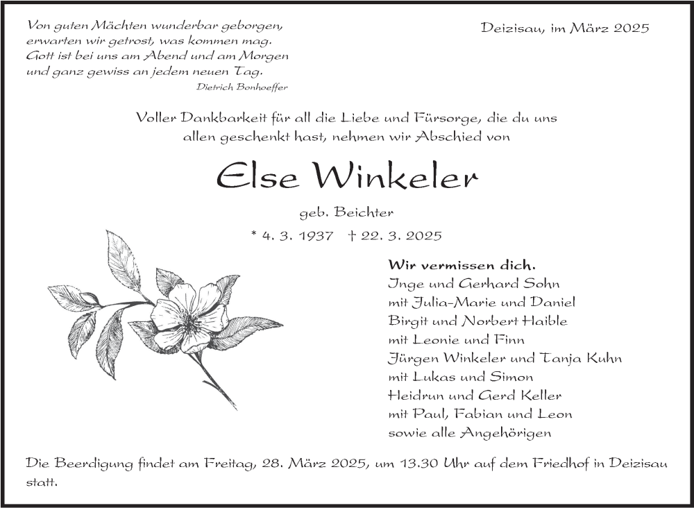 Hier finden Sie alle Traueranzeigen aus der Zeitung, die bisher für Else Winkeler erschienen sind. Weitere Traueranzeigen, die in der Zeitung erscheinen, werden hier ebenfalls aufgelistet