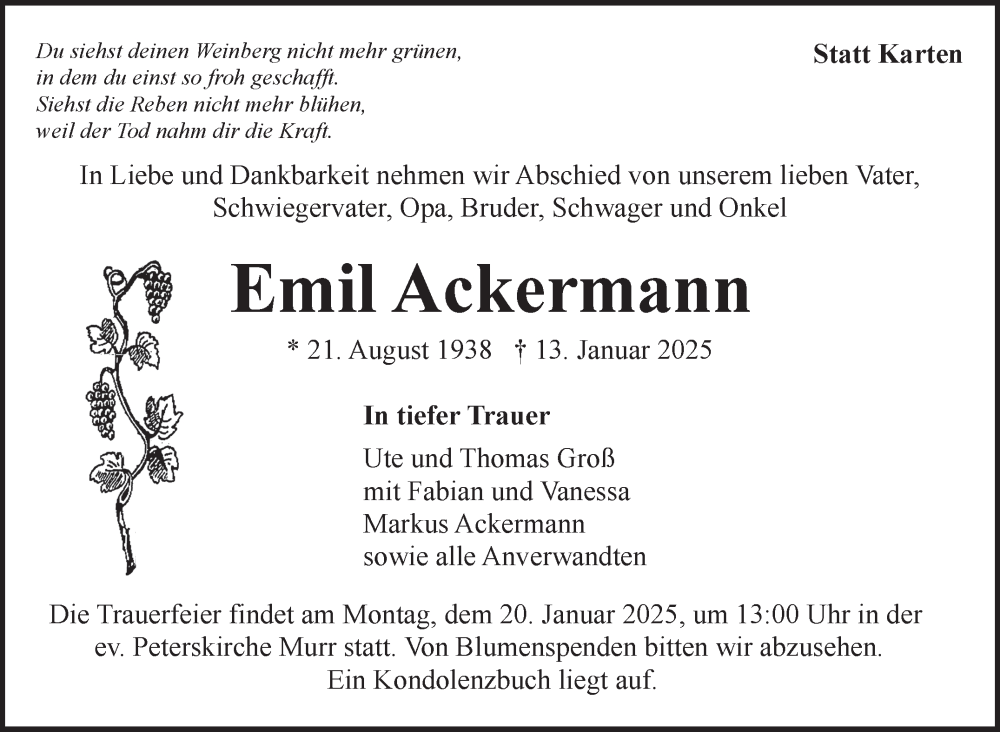 Hier finden Sie alle Traueranzeigen aus der Zeitung, die bisher für Emil Ackermann erschienen sind. Weitere Traueranzeigen, die in der Zeitung erscheinen, werden hier ebenfalls aufgelistet