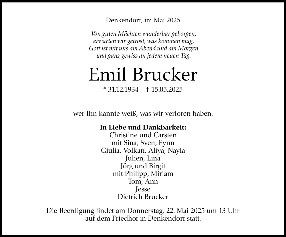 Hier finden Sie alle Traueranzeigen aus der Zeitung, die bisher für Emil Brucker erschienen sind. Weitere Traueranzeigen, die in der Zeitung erscheinen, werden hier ebenfalls aufgelistet