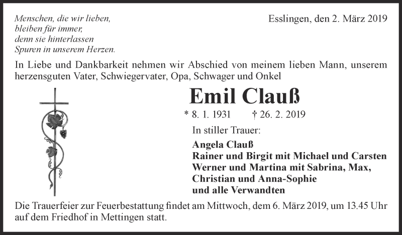 Hier finden Sie alle Traueranzeigen aus der Zeitung, die bisher für Emil Clauß erschienen sind. Weitere Traueranzeigen, die in der Zeitung erscheinen, werden hier ebenfalls aufgelistet