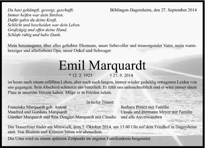 Hier finden Sie alle Traueranzeigen aus der Zeitung, die bisher für Emil Marquardt erschienen sind. Weitere Traueranzeigen, die in der Zeitung erscheinen, werden hier ebenfalls aufgelistet