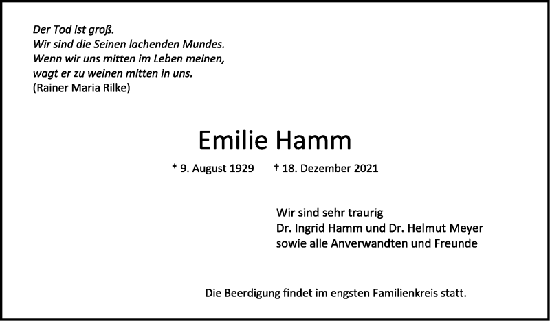 Hier finden Sie alle Traueranzeigen aus der Zeitung, die bisher für Emilie Hamm erschienen sind. Weitere Traueranzeigen, die in der Zeitung erscheinen, werden hier ebenfalls aufgelistet