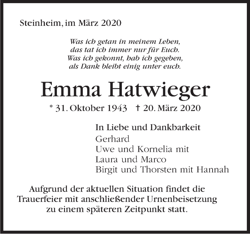 Hier finden Sie alle Traueranzeigen aus der Zeitung, die bisher für Emma Hatwieger erschienen sind. Weitere Traueranzeigen, die in der Zeitung erscheinen, werden hier ebenfalls aufgelistet