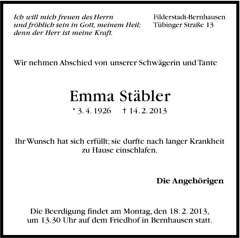 Hier finden Sie alle Traueranzeigen aus der Zeitung, die bisher für Emma Stäbler erschienen sind. Weitere Traueranzeigen, die in der Zeitung erscheinen, werden hier ebenfalls aufgelistet