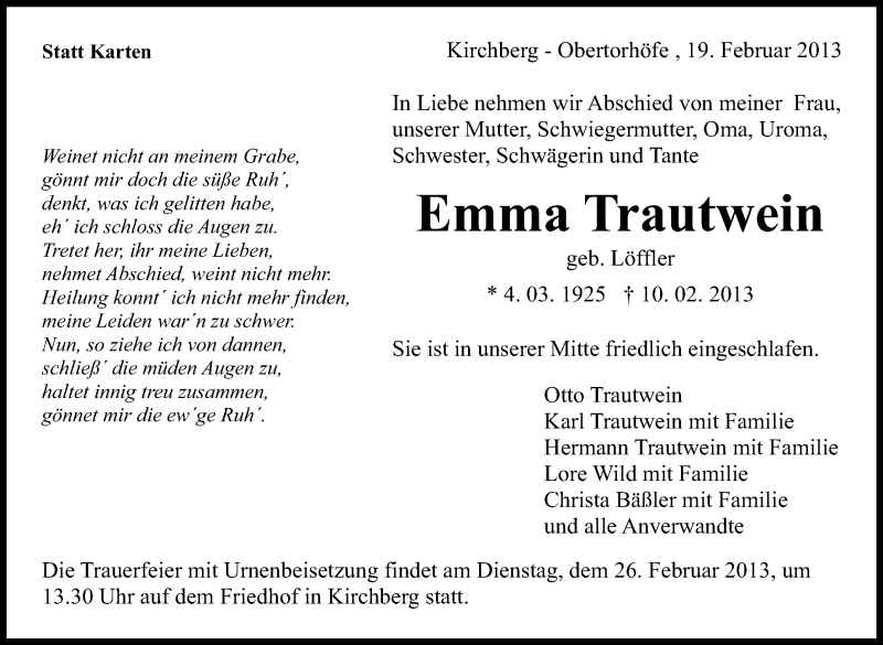 Hier finden Sie alle Traueranzeigen aus der Zeitung, die bisher für Emma Trautwein erschienen sind. Weitere Traueranzeigen, die in der Zeitung erscheinen, werden hier ebenfalls aufgelistet