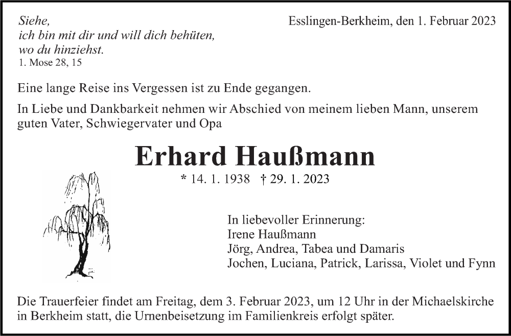 Hier finden Sie alle Traueranzeigen aus der Zeitung, die bisher für Erhard Haußmann erschienen sind. Weitere Traueranzeigen, die in der Zeitung erscheinen, werden hier ebenfalls aufgelistet