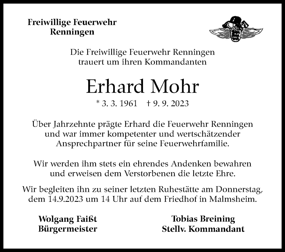 Hier finden Sie alle Traueranzeigen aus der Zeitung, die bisher für Erhard Mohr erschienen sind. Weitere Traueranzeigen, die in der Zeitung erscheinen, werden hier ebenfalls aufgelistet