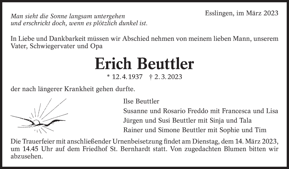 Hier finden Sie alle Traueranzeigen aus der Zeitung, die bisher für Erich Beuttler erschienen sind. Weitere Traueranzeigen, die in der Zeitung erscheinen, werden hier ebenfalls aufgelistet