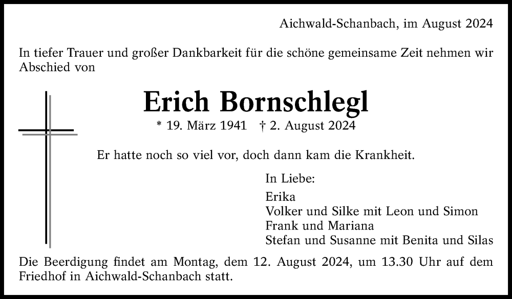Hier finden Sie alle Traueranzeigen aus der Zeitung, die bisher für Erich Bornschlegl erschienen sind. Weitere Traueranzeigen, die in der Zeitung erscheinen, werden hier ebenfalls aufgelistet