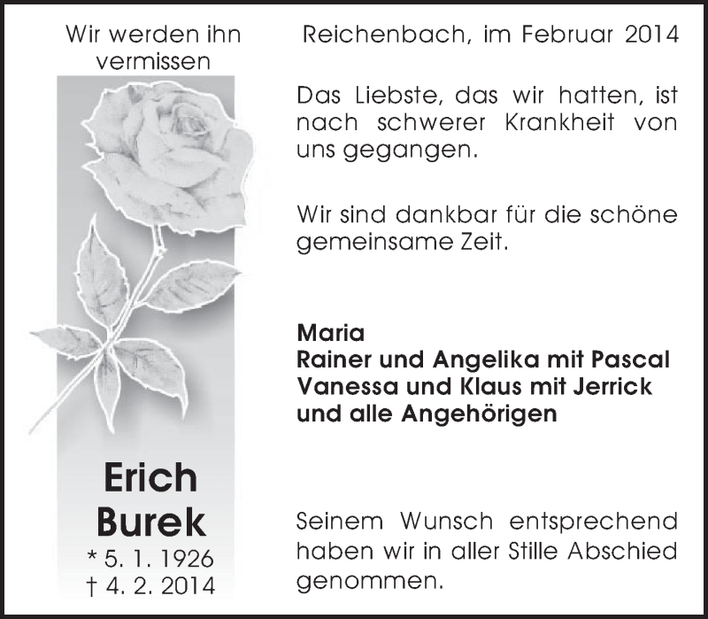 Hier finden Sie alle Traueranzeigen aus der Zeitung, die bisher für Erich Burek erschienen sind. Weitere Traueranzeigen, die in der Zeitung erscheinen, werden hier ebenfalls aufgelistet