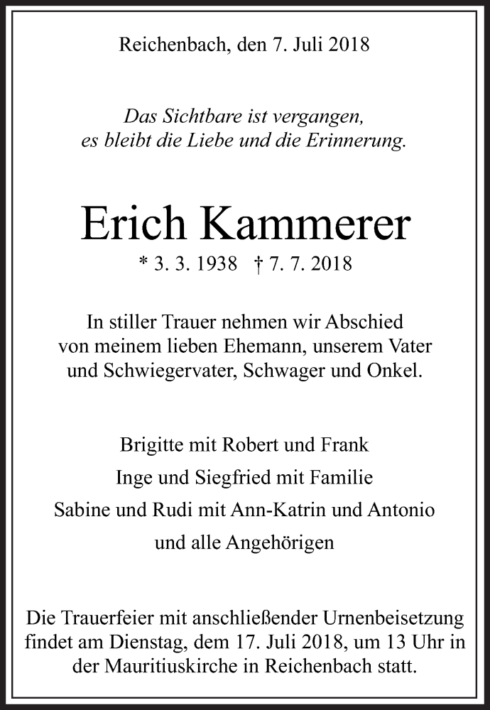 Hier finden Sie alle Traueranzeigen aus der Zeitung, die bisher für Erich Kammerer erschienen sind. Weitere Traueranzeigen, die in der Zeitung erscheinen, werden hier ebenfalls aufgelistet