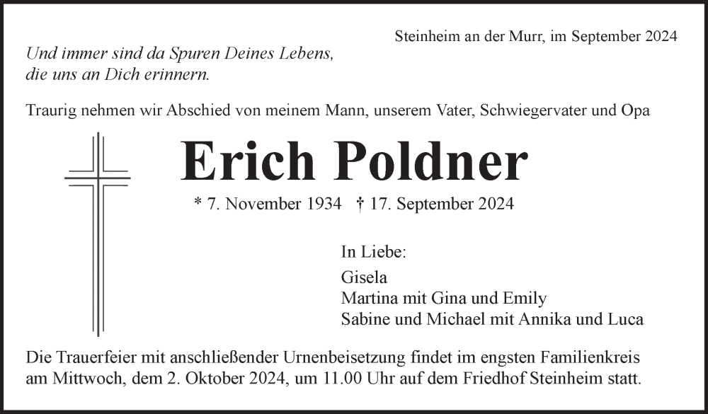 Hier finden Sie alle Traueranzeigen aus der Zeitung, die bisher für Erich Poldner erschienen sind. Weitere Traueranzeigen, die in der Zeitung erscheinen, werden hier ebenfalls aufgelistet