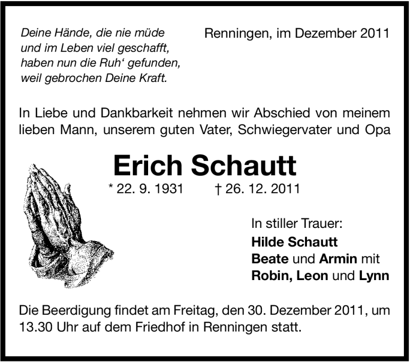 Hier finden Sie alle Traueranzeigen aus der Zeitung, die bisher für Erich Schautt erschienen sind. Weitere Traueranzeigen, die in der Zeitung erscheinen, werden hier ebenfalls aufgelistet