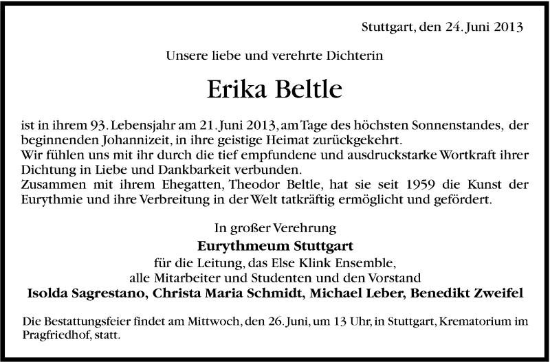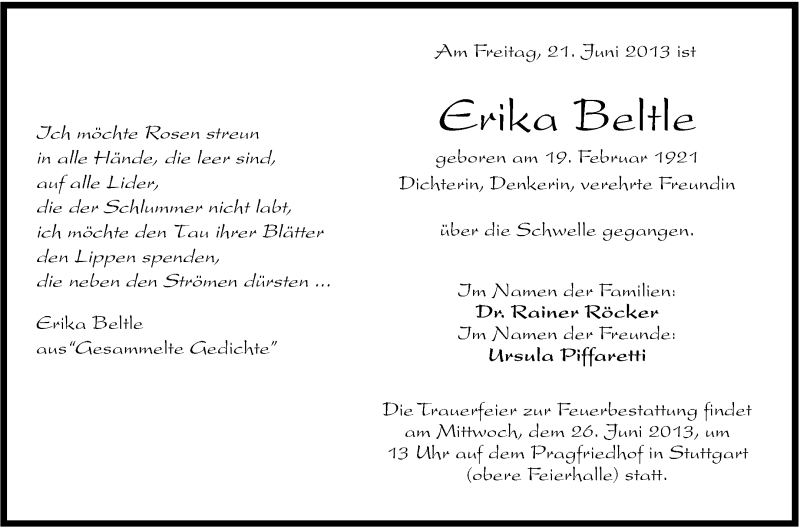 Hier finden Sie alle Traueranzeigen aus der Zeitung, die bisher für Erika Beltle erschienen sind. Weitere Traueranzeigen, die in der Zeitung erscheinen, werden hier ebenfalls aufgelistet