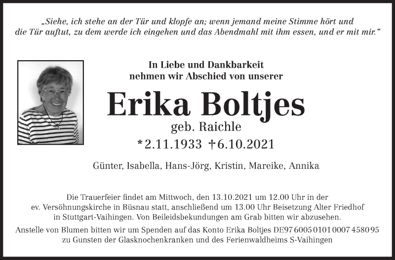 Hier finden Sie alle Traueranzeigen aus der Zeitung, die bisher für Erika Boltjes erschienen sind. Weitere Traueranzeigen, die in der Zeitung erscheinen, werden hier ebenfalls aufgelistet