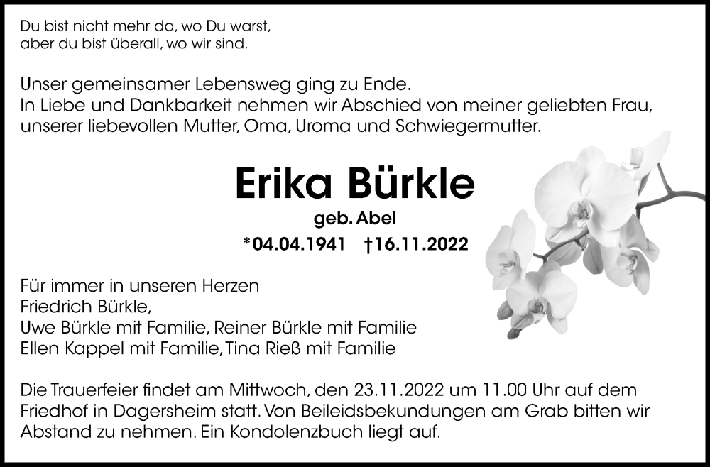 Hier finden Sie alle Traueranzeigen aus der Zeitung, die bisher für Erika Bürkle erschienen sind. Weitere Traueranzeigen, die in der Zeitung erscheinen, werden hier ebenfalls aufgelistet