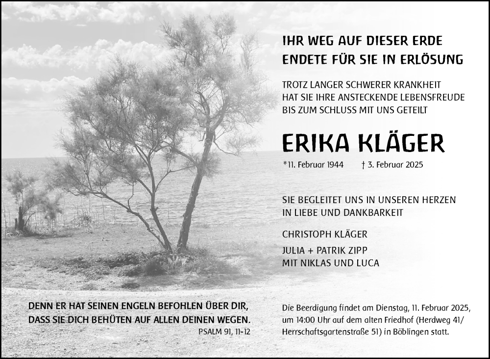 Hier finden Sie alle Traueranzeigen aus der Zeitung, die bisher für Erika Kläger erschienen sind. Weitere Traueranzeigen, die in der Zeitung erscheinen, werden hier ebenfalls aufgelistet