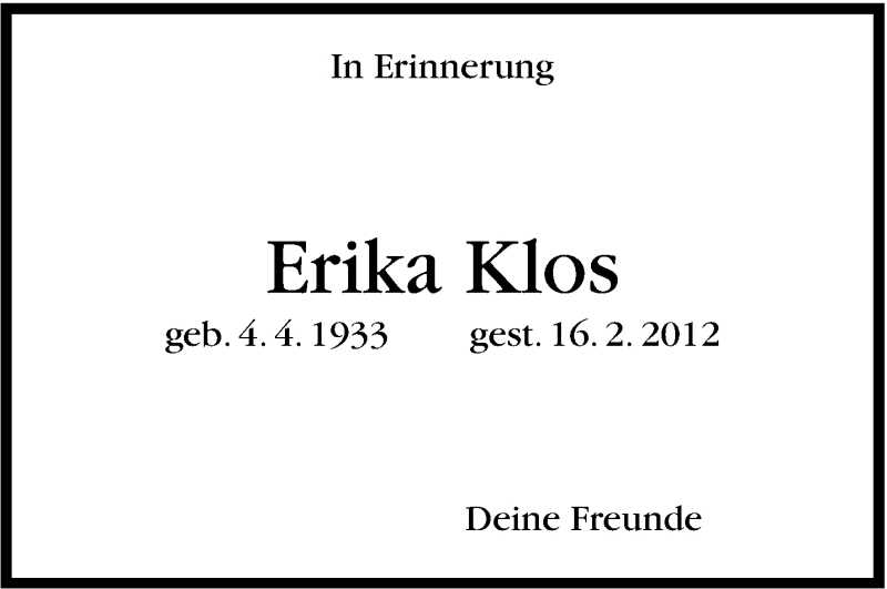 Hier finden Sie alle Traueranzeigen aus der Zeitung, die bisher für Erika Klos erschienen sind. Weitere Traueranzeigen, die in der Zeitung erscheinen, werden hier ebenfalls aufgelistet